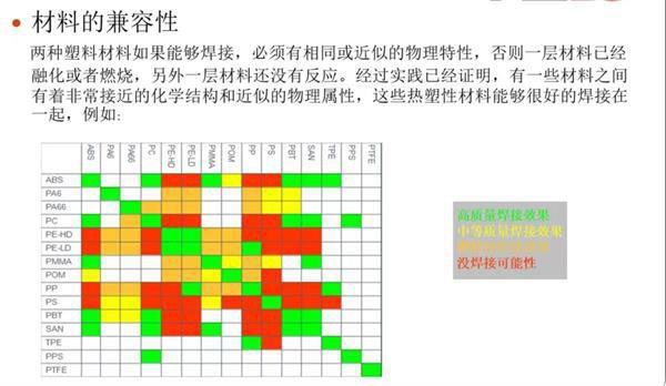 許多用戶詢問彩色塑料組合間的焊接問題,一般而言,其焊接難度和成本如下: